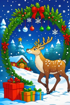 miluo_sdch,Christmas theme, snow, gifts, Christmas, tree, pine tree, Christmas tree, solo, reindeer, antlers, night, wreath, sky <lora:米洛丨圣诞插画sd1.5-v1.0:0.8>