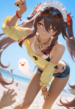 masterpiece,best quality,amazing quality,very aesthetic,absurdres,newest,scenery,impactful picture,offcial art,movie perspective,(chiaroscuro:0.5),(WANKE:0.5),(yunsang:0.5),(ningen mame:0.5),by (yoneyama mai:0.5) and (rella:0.5) and (Ilya Kuvshinov:0.5),hu tao \(genshin impact\),long sleeves,flower-shaped pupils,brown hair,very long hair,twintails,thighs,ghost,maid,maid headdress,apron,wrist cuffs,frills,paw pose,depth of field,hair over one eye,midriff,jewelry,tanlines,eyewear on head,bracelet,necklace,off shoulder,day,denim shorts,blue sky,outdoors,off-shoulder shirt,bent over,short shorts,leaning forward,alternate costume,(three quarter view:1),(from below:0.4),(dutch angle:0.5),floating hair,shirt,side-tie bikini bottom,beach,bare shoulders,yellow shirt,realistic,alternate costume,dramatic backlight,vibrant,[flat-pasto:photorealistic:0.6],