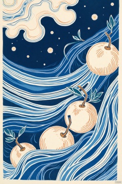There are several fruits with a few leaves,simple background, by Tom Duxbury ((with thick lines)). Loose lines, infinity hieroglyph waves,icy landscape,by Li ,calligraphic poetry,