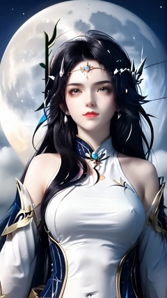 The image is a digital illustration of a young woman with long dark hair and a crown of thorns on her head. She is wearing a white and blue outfit with gold accents. The outfit has a high neckline and long sleeves,and she is holding a sword in her right hand. The woman is standing in front of a full moon,with a blue sky and clouds in the background. She has a serious expression on her face and is looking directly at the camera. The overall mood of the image is mystical and powerful.,<lora:pony玄衣-000005:0.8>,
