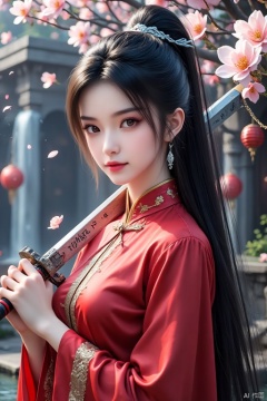 1 girl, solo, long hair, looking at the viewer, black hair, hair accessories, long sleeves, dress, jewelry, upper body, ponytail, earrings, red cheongsam, Chinese clothing, fabrics have traces of time, with the golden silk edge, looks simple yet fashionable. White Phnom Penh hair ornaments, she held a long iron sword, sword engraved with ancient runes, eyes show determination and determination.