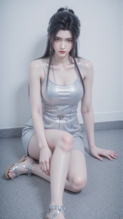 A young Asian woman sits on the floor covered with a gray carpet. She was wearing a silver sleeveless dress adorned with small diamond shaped patterns. Her hair was combed back into a bun, and her eyes were deep blue. She was wearing a pair of silver lace up sandals. Her left hand is on the floor and her right hand is on her buttocks. The background is a pure white wall, adding a touch of contrast to the scene.