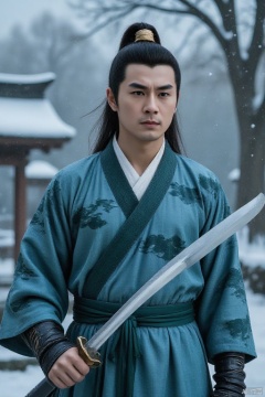 The picture shows a 33-year-old man, appearing alone. He has long black hair in a ponytail and topknot. He has a handsome face and a cold and resolute expression. He is the focus of the picture. The man is wearing classical-style clothing. The main color of the top is blue-green. The white lining at the neckline has a distinct layering. The top is decorated with dark green patterns, which looks like a landscape painting or cloud pattern. The overall clothing style is very elegant. The man is holding a katana-style sword and standing in the snow. The style of the picture is relatively realistic, showing the martial arts style, giving people a mature and well-groomed feeling.,hanfu