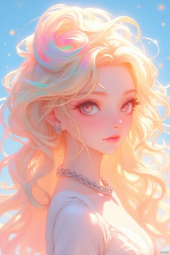 An animated image of a blonde woman with long, wavy blonde hair. The woman's hair is adorned with pink, orange, and blue swirls. She is wearing a white dress with a silver chain around her neck. The background is a light blue sky with white stars.
