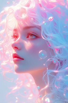 An eye-level view of a woman's face, the woman's head is covered in a pinkish-pink tint, and her hair cascades over her shoulders. The woman's eyes are open, and she's looking to the left side of the frame. Her hair is a mix of white, pink, and blue, and there are a lot of bubbles floating around her, adding a touch of color to the scene.
