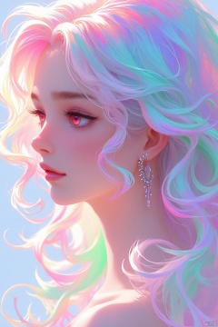 An animated image of a woman with long, wavy blonde hair. The woman's hair is a mix of pink, purple, green, and blue. Her eyes are a deep red, and her lips are a lighter shade of pink. Her hair is cascading down her back. She is wearing a pair of earrings, and the earrings are adorned with small stones. The background is a pale blue.
