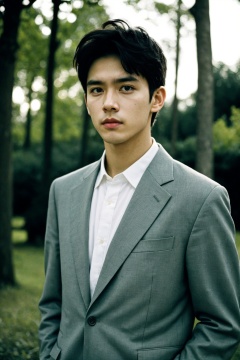f8.0, noise, jpeg artefacts, poor lighting, low light, underexposed, high contrast, solo, 1boy, film grain, realistic, photorealistic, male focus, looking at viewer, suit, tree, outdoors,