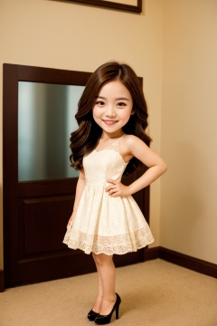 1woman, solo, film grain, realistic, photorealistic, long hair, dress, brown hair, brown eyes, white dress, smile, standing, looking at viewer, full body, chibi, high heel shoes, sleeveless dress, indoors,