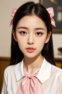 1girl, solo, film grain, realistic, photorealistic, long hair, looking at viewer, black hair, hair ornament, shirt, parted lips, white shirt, neckerchief, black eyes, upper body, lips, indoors, bow, hair bow, pink bow, nose, pink neckerchief, ribbon,