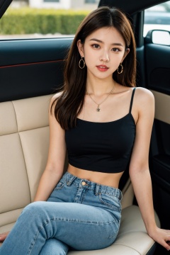 1girl, solo, car interior, jewelry, brown hair, looking at viewer, pants, necklace, realistic, denim, jeans, sitting, parted lips, long hair, camisole, car, brown eyes, blurry, blue pants, motor vehicle, breasts, lips, collarbone, blurry background, bare shoulders, crossed legs, crop top, small breasts, k-pop, photorealistic, **** top, blue camisole, sleeveless, shirt, red lips, earrings, black eyes, midriff, teeth, spaghetti strap, day, depth of field, feet out of frame, fur coat, nose