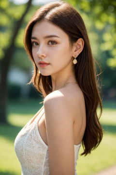 1girl, jewelry, solo, earrings, realistic, long hair, looking at viewer, blurry background, blurry, outdoors, brown hair, lips, photorealistic, upper body, day, from side, sleeveless, nose, depth of field, necklace, breasts, tree, dress, white dress, looking to the side, medium breasts, sunlight, bare shoulders, closed mouth