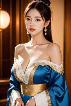 1girl, solo, dress, long hair, hair ornament, breasts, bare shoulders, chinese clothes, jewelry, earrings, realistic, hair bun, blue dress, looking at viewer, sash, off shoulder, upper body, white dress, brown hair, parted lips, black hair, cleavage, large breasts, long sleeves