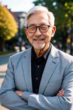 1boy, male focus, old, solo, glasses, old man, facial hair, tree, outdoors, beard, realistic, white hair, upper body, crossed arms, closed eyes, jacket, shirt, black jacket, open mouth, long sleeves, facing viewer, black-framed eyewear, collared shirt, day, smile, black shirt, short hair, blurry, looking at viewer, wrinkled skin, teeth