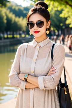 1girl, photo background, sunglasses, outdoors, realistic, jewelry, crossed arms, earrings, day, bag, watch, wristwatch, handbag, real world location, shirt, photorealistic, brown hair, solo, short hair, white shirt, lips, tree, solo focus, smirk, looking at viewer, blurry, black hair, long sleeves, buttons, upper body, river, building, standing, houlder bag, closed mouth, blurry background, people, pants, fashion, bracelet, tiara, lipstick, nature, single hair bun, makeup, dress