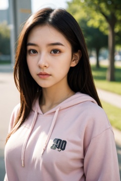 1girl, solo, teenage, film grain, realistic, photorealistic, long hair, looking at viewer, breasts, black hair, black eyes, upper body, hoodie, outdoors,