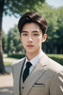 solo, 1boy, film grain, realistic, photorealistic, male focus, looking at viewer, suit, tree, outdoors,