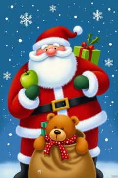 Captured at eye-level, a medium-sized painting of Santa Claus, dressed in a red and white Santa suit, adorned with a green apple and a brown teddy bear, sitting in a brown bag, holding a green gift box. The Santa Claus is adorned with white fur, a white beard, and a red hat. The background is a deep blue, dotted with white snowflakes, adding a festive touch to the scene.