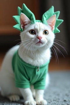 A close-up view of a white cat with a green mask on its head. The cat's eyes are black, and the cat's whiskers are white. The background is blurred, but the cat is sitting on a gray carpet.