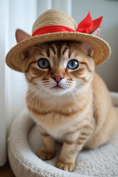 A close-up shot of a tan tabby cat with a straw hat on its head. The cat's eyes are blue, and the cat's whiskers are white, while its nose is pink. The hat is adorned with a red ribbon, and it is placed on top of a white pet bed. The background is blurred, and there is a white curtain on the left side of the frame.
