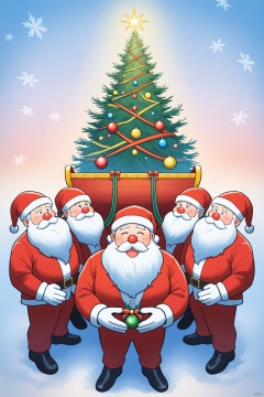 watercolor,Softly lit Christmas scene: Santa Claus, surrounded by a warm glow, stands amidst a whimsical watercolor-inspired backdrop of snowflakes and festive holly. The saintly figure, dressed in his iconic red suit, holds a delicate wooden sleigh, adorned with sparkling ornaments. A majestic Christmas tree, painted in gentle hues, rises behind him, its branches heavy with glistening baubles.