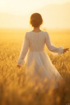 a young girl stands in a field of wheat, her hair cascades in a bun. She is dressed in a white long-sleeved dress adorned with white polka dots. Her arms are stretched out to her sides, adding a touch of movement to the scene. The field she is standing in is adorned with tall, yellow wheat stalks, and the sun is setting in the distance.