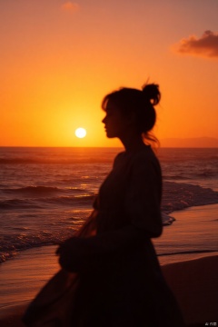 a silhouette of a woman stands on a beach, facing the ocean. The woman's shadow is cast on her body, adding a touch of color to the scene. The sky is a vibrant orange, with a few wispy clouds in the upper right corner of the frame. The sun is setting in the distance, casting a warm glow over the water. The water is a dark blue, with small ripples in it.