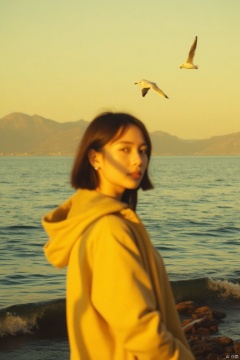 Captured at eye-level, a close-up view of a woman in a yellow jacket is seen in front of a body of water. The woman's shadow is cast on her face, adding a pop of color to the scene. In the background, a seagull is flying in the air, its wings spread wide, while its tail is spread wide. The sea is calm, with small ripples all over it. The sky is a muted yellow, with a mountain range in the background.