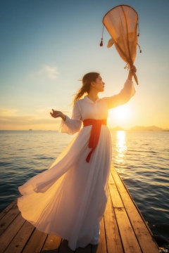 a woman dressed in a long white dress, adorned with a red belt, stands on a wooden pier that overlooks a body of water. The woman's head is turned to the left, her hair cascading in a ponytail, and she is holding a net in her right hand. The net is held up in the air, adding a touch of warmth to the scene. The sky is a deep blue, with a few wispy clouds, and the sun is shining, creating a brilliant orange hue.