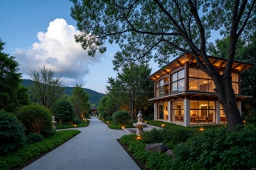 A serene scene unfolds: a winding road stretches towards a charming house nestled beneath a majestic tree's sprawling canopy. The building's facade gleams in the warm light of a blue sky dotted with puffy clouds, as if infused with an essence of serenity. Framed by lush foliage, the architectural scenery exudes a sense of peace and tranquility.