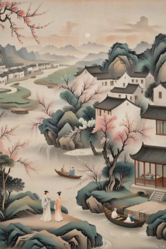 National style landscape painting, a winding river with peach blossoms blooming on both sides, boats on the river surface, and figures wearing long robes on the riverbank, bidding farewell to those who are wearing them. Ultra high definition, antique style, ultra-high quality.,