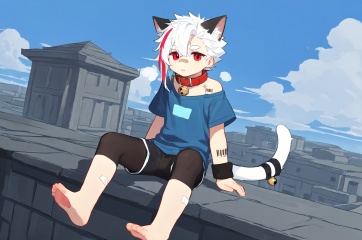 Right mid length drooping frontal hair,(Asymmetric hair on the temples:1.2),Expose left shoulder,wristband,thick eyebrows,barcode tattoo,heavy_breathing,AKIRA,cat boy,1boy,solo,male_focus,(white_hair:0.8),red eyes,[bell on collar,Collar,Cortical collar,Large collar],(blue t-shirt,black_leggings under shorts,black bike_shorts),(barefoot) BREAK dutch angle,vanishing point,sitting on rooftop,(blue sky,cloud,wind),(masterpiece, best quality:1.1),foot focus,bandage on nose,bandage on leg,Tail decoration,cat tail,<lora:雨α:0.4>,