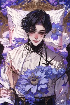 1boy, masterpiece,best quality,high quality,, smile, ribbon, lying,  on_back, flower, pillow,looking_at_viewer, blush,  bed_sheet, food, purple_flower,