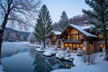 A serene winter wonderland scene: a majestic evergreen tree stands tall and proud beside the frozen surface of a tranquil lake, its branches gently swaying in the crisp morning air. A charming rustic cabin, adorned with snow-dusted roofs and twinkling window lights, nestles cozily nearby, emitting a warm glow that contrasts beautifully with the icy blues and whites of the natural surroundings.