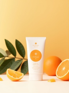 miluo_bzqx, This is a photograph featuring a minimalist, stylish arrangement of beauty products and fresh fruits against a warm, gradient background. The background transitions from a light yellow at the top to a soft orange at the bottom, creating a soothing, inviting ambiance. Central to the image is a white tube of skincare product with a round orange label and the word "HYDRATE" printed in elegant white letters. The label also includes a small, stylized orange and white logo.To the left of the tube, there is a lush green leafy plant with broad leaves, adding a touch of natural beauty. Surrounding the skincare tube are various citrus fruits, including a halved orange placed in the bottom left corner, a whole orange to the right of the tube, and another halved orange positioned behind the tube, slightly to the right. Scattered around are small orange slices, enhancing the fresh, citrusy theme.The arrangement is set on a clean, white surface that contrasts with the warm colors of the background and products. The overall aesthetic is clean and modern, emphasizing the natural and refreshing qualities of the products. The photograph captures a sense of elegance and simplicity, making it visually appealing and easy to understand.<lora:miluo丨包装设计-小清新-flux-1.3:1>