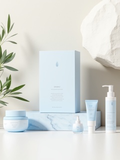 miluo_bzqx, The image is a photograph showcasing a minimalist, modern skincare product display. The background features a textured, off-white wall with a large, smooth, white rock in the upper right corner, adding a natural element. To the left, a small, lush green olive branch with slender, elongated leaves adds a touch of nature.In the foreground, a set of skincare products is arranged on a clean, white surface. The products are predominantly white with light blue accents, featuring a consistent, elegant design. The primary item is a rectangular box with a soft, matte finish, placed centrally on a light blue, marble-textured block. This box has a minimalist logo and text in a clean, sans-serif font.Surrounding the box are various skincare items, including a round, white jar with a light blue lid to the left, a cylindrical white bottle with a light blue cap and label to the right, and a small, white pump bottle with a light blue label in the center. Each item has a simple, modern aesthetic, emphasizing a clean and sophisticated look. The overall composition is balanced and visually appealing, emphasizing the products' simplicity and elegance. <lora:miluo丨包装设计-小清新-flux-1.3:1>