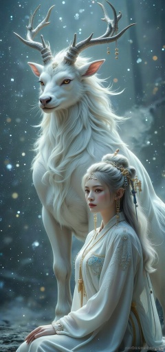 Surrealist photography, Canon EOS, f/1.8, 85mm lens, ancient Chinese scene, giant object, one of the gods of ancient Chinese mythology and legend, it is a white deer with four horns. Behemoth, it is flanked by an Asian beauty, Hanfu martial arts style, low angle perspective, surreal size contrast, high detail, keen attention to white deer and women, snow, film photography, decisive moments, cinematic lighting, viewpoint, masterpiece, ultra-high resolution, 500 years 16 K-AR 2:3 This woman is wearing a white Qin Dynasty Hanfu, a faded Hanfu, a hairpin headband on her head, long hair with a shawl, white hair, in a snowy night, there is a huge four-horned white deer, full of Zen atmosphere, the material of her clothes, the details of Luo Manxue, the serene expression on her face, the side face, and the intimate posture of the giant deer with her head down, the whole picture of the movie is very cinematic, it is a masterpiece, a cinematic tone, the serene expression of the deer, the footage of the cowboy,msj