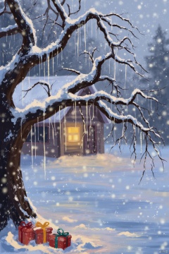 The branches of the tree are gracefully bent under the weight of the snow, each twig delicately outlined. Glistening icicles hang from the tips, refracting the soft ambient light. Beneath the tree, a scattering of colorfully wrapped presents peek out from the snowdrifts, their ribbons and bows adding a touch of festive charm. In the background, a faint glow of warm light from a nearby cabin seeps through the falling snowflakes, casting a gentle halo over the scene. The air is filled with a sense of stillness and the magic of Christmas.
