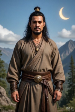 A man is standing alone outdoors. He has long hair with hair accessories and hairpins. His hair is black, he has brown eyes, he has a beard, mustache and mustache on his face. He wears jewelry and long-sleeved clothes. and wore a belt and tassels. He is looking at the viewer, with the sky, clouds, trees, and mountains behind him. There is also a crescent moon and a crescent moon hanging high in the sky. The overall picture focuses on men.