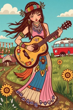 Head tilted downward, both hands holding an acoustic guitar adorned with painted flowers, eyes peeking out dreamily from under her bangs as she strums a melody of peace and love.,Paper cutting,cgart illustration