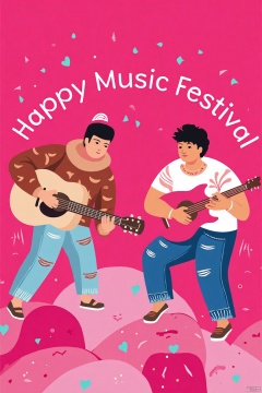 renyu Color spot,renyu Color spot,of a vibrant digital illustration,In this picture, presented in flat style, we are transported into a scene full of energy and musical atmosphere. It was the scene of a music festival, and three young men were strumming their guitars with rapt attention, some in overpants, some in hats, some in printed T-shirts, a gesture of concentration and commitment that filled every note with emotion. They play a beautiful melody together. The background is composed of pink and magenta interwoven color blocks, which are dotted with small cyan hearts, and at the top is the message "Happy Music Festival" written in English white font,Minimalism illustration, flat color