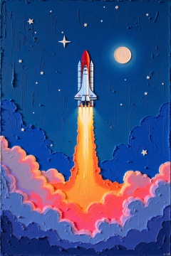 oil pastels,sky, military, no humans, night, moon, fire, star \(sky\), full moon, flying, science fiction, aircraft, airplane, vehicle focus, spacecraft, rocket,Oil painting stick