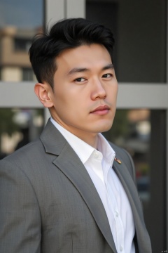jzns,zuk,1man,solo,realistic,male focus, shirt, blurry, blurry background, white shirt, portrait, grey suit, looking back,masterpiece, realistic, best quality, highly detailed,zuk