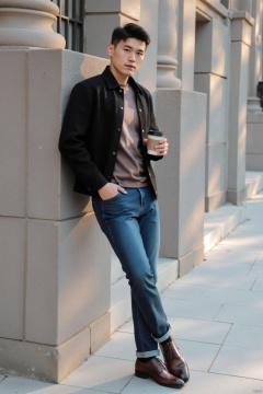 jzns,zuk,1man,solo,realistic,male focus, holding cup, hand in pocket, outdoors, brown footwear, black jacket, full body, feet crossed, black jacket,blue jeans, brown T-shirt, leaning against the wall, looking at viewer