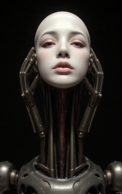 An eerie close-up shows a severed human head held aloft by a polished robotic arm. The head faces the viewer directly, its lifeless eyes half-open, and a frozen look on its face. A strange expression between fear and submission, with pale skin It is white and clammy, with a faint trace of blood extending from the neck to the metal fingers holding it tightly. The picture captures the delicate details - the texture of the skin, the hair clinging to the scalp - with an unsettling realism. , and the vague bruises around the neck, this robotic arm The lines are smooth and human-shaped. It is made of polished steel and is engraved with complex patterns in the Art Nouveau style. Its precision and elegance are in sharp contrast to the weird and terrifying scene. The background is simple and dark, with a faint and warm light. illuminated the head and in the metal With soft reflections cast on the arms and light focused on the head, emphasizing every morbid detail while casting the rest of the robot and its surroundings in ominous gloom, the composition is both haunting and intricate. , perfectly blending horror elements with machinery,IMPROVED,Lisa,UNI_SCI_FI_CORE