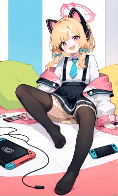 (score_9,score_8_up,score_7_up), (masterpiece),( beautiful),(high quality),(finely detailed),extremely detailed CG unity 8k wallpaper,best quality, 1girl, solo, looking at viewer, blush, smile, open mouth, bangs, skirt, blonde hair, simple background, shirt, red eyes, thighhighs, long sleeves, white background, bow, holding, animal ears, sitting, school uniform, jacket, full body, white shirt, hair bow, pleated skirt, necktie, collared shirt, black thighhighs, black skirt, pink eyes, off shoulder, fake animal ears, headphones, halo, no shoes, white jacket, suspenders, blue necktie, indian style, handheld game console, nintendo switch, animal ear headphones, cat ear headphones, momoi \(blue archive\),momoiBA