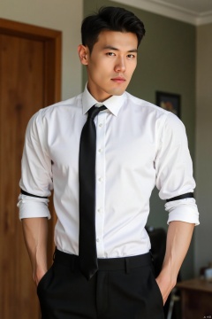jzns,zuk,1man,solo,realistic,male focus,solo, black pants, white shirt, black necktie, collared shirt, looking at viewer, standing, sleeve garter,armband, sleeves rolled up, bust, untied necktie, indoors, masterpiece, realistic, best quality, highly detailed,zuk