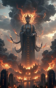 (best quality), ultra-detailed, (masterpiece), finely detail, highres, 8k wallpaper,(a 10,000-meter-high stone Buddha standing in the sky), sitting on the earth, ((head above the clouds), (lower body below the clouds), (wearing a mask :1.5), (standing in front of more than 10,000 burning incense), incense 2 meters thick, 3 kilometers to 8 height, incense, each incense written on the curve of wealth, (The incense smoke rises and gathers into the clouds to form thick black clouds), a 20-meter kite floats above the clouds, and a burning incense stick is attached to the kite, (a group of modern buildings stands at the bottom of the picture), (Wands) incense :1.5, (((close your eyes))),