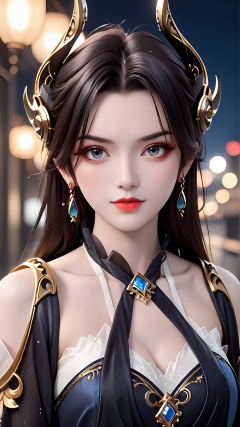 The image is a close-up portrait of a young woman with long dark hair and a fierce expression on her face. She is wearing a black and gold outfit with a blue necklace and earrings. Her hair is styled in a dramatic updo with two large,ornate horns on either side of her head. The horns are gold and appear to be made of metal. The background is blurred,but it appears to be a cityscape with buildings and lights. The overall mood of the image is dark and mysterious.,<lora:pony曹颖:0.8>,