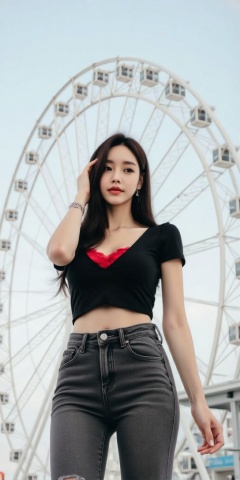 This photograph captures a young woman standing in front of a large Ferris wheel, taken from a low, upward angle. She has light skin and long, black hair that is slightly tousled. She is wearing a black, short-sleeved crop top and high-waisted,part of red bra can be seen, dark-wash skinny jeans with ripped knees, emphasizing a casual, edgy style. Her left hand is lifted, running through her hair, while her right arm hangs by her side. She wears a silver bracelet on her right wrist. The Ferris wheel behind her is illuminated with white lights, creating a contrast against the pale blue sky. The composition follows the rule of thirds, with the woman positioned off-center to the right, leading the viewer's eye up to the Ferris wheel. The lighting is natural, likely from the sun, providing even illumination without harsh shadows. The overall mood of the image is casual and adventurous, capturing a moment of youthful spontaneity.