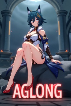 A striking movie poster featuring Yukong, a 1girl solo character with blue hair, short hair, bangs, and hair between eyes. She has blue eyes, an elegant dress with detached sleeves, bare shoulders, medium breasts, and animal ears. She is sitting in a dynamic pose, wearing high heels, with full body visible and legs elegantly positioned. The background is atmospheric, with soft lighting enhancing her presence. Below her, three-dimensional text AGlong stands out, aligned with the poster's theme. The composition is balanced, drawing attention to her gaze and the text.